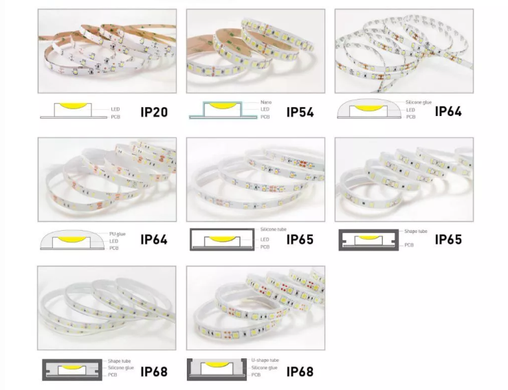 選擇IP等級很簡單。環境越惡劣、灰塵越多,您需要的 IP 保護就越多。通常,低IP等級條適合室內使用。如果您想要防水 LED 燈條,請選擇防護等級為 IP65、IP67 或 IP68 等級的燈條。根據要安裝 LED 燈條的條件選擇保護級別。